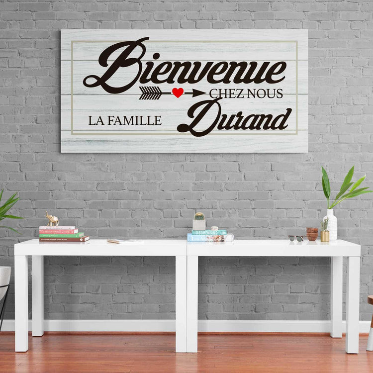Ce tableau de"Bienvenue" personnalisé est le cadeau idéal à offrir à votre famille, à un ami ou à un couple. Il vous suffit d'indiquer le nom de famille que vous souhaitez y inscrire.