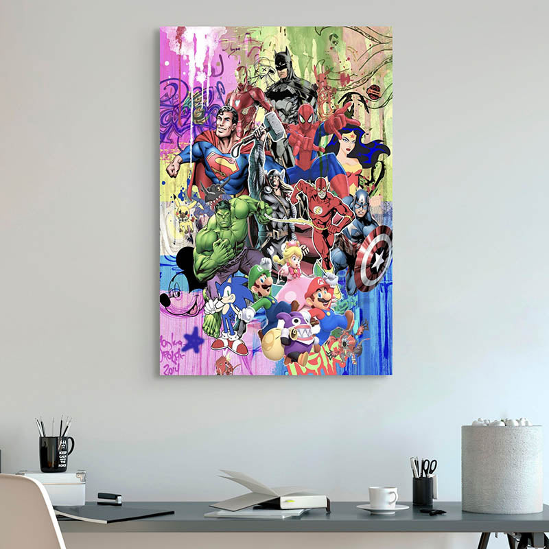 Que vous soyez fan de super-héros, de jeux vidéo ou de dessins animés iconiques, ce tableau Street Art – Urban Pop Icons est fait pour vous ! Avec ses couleurs vives, son effet graffiti et son design audacieux, il capture toute l’énergie et l’héritage des personnages les plus cultes de la pop culture.