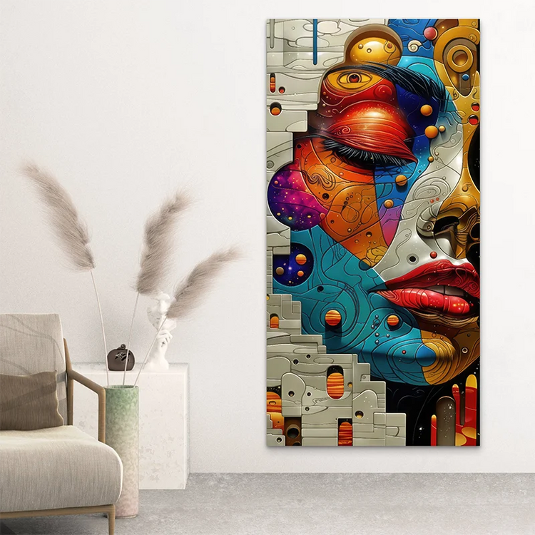 L'œil est attiré par la symétrie brisée, les textures métalliques et les couleurs cosmiques. Ce portrait éclaté mêle subtilement le rouge des émotions, le bleu de l'infini, le doré solaire et des éléments architecturaux modernes pour créer une énergie visuelle magnétique.