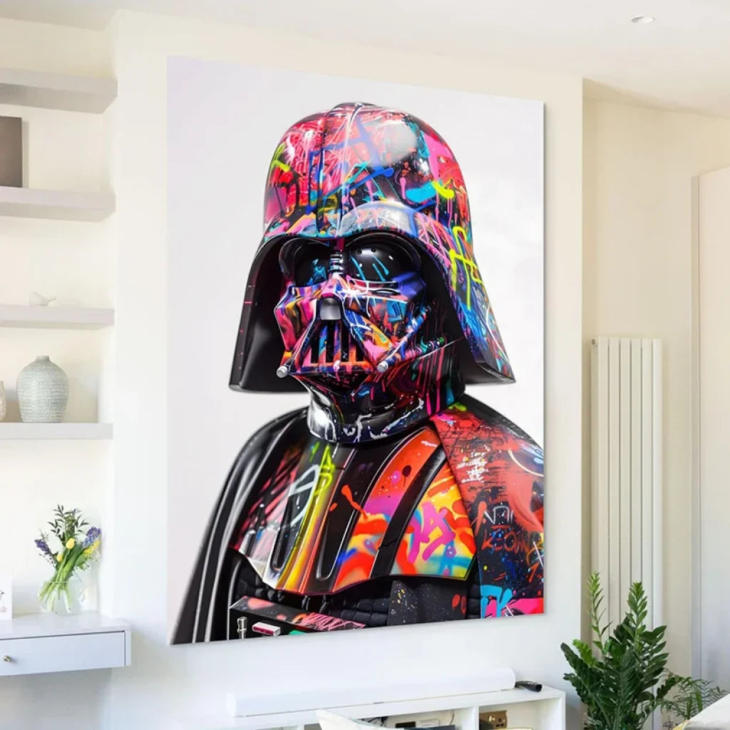 Plongez dans une collision visuelle entre la pop culture intergalactique et le street art contemporain. Le tableau "Graffiti Galaxy" réunit deux figures cultes revisitées avec audace : un Stormtrooper stylisé façon Louis Vuitton et un Darth Vader saturé de couleurs urbaines, pour un rendu aussi puissant que provocateur.